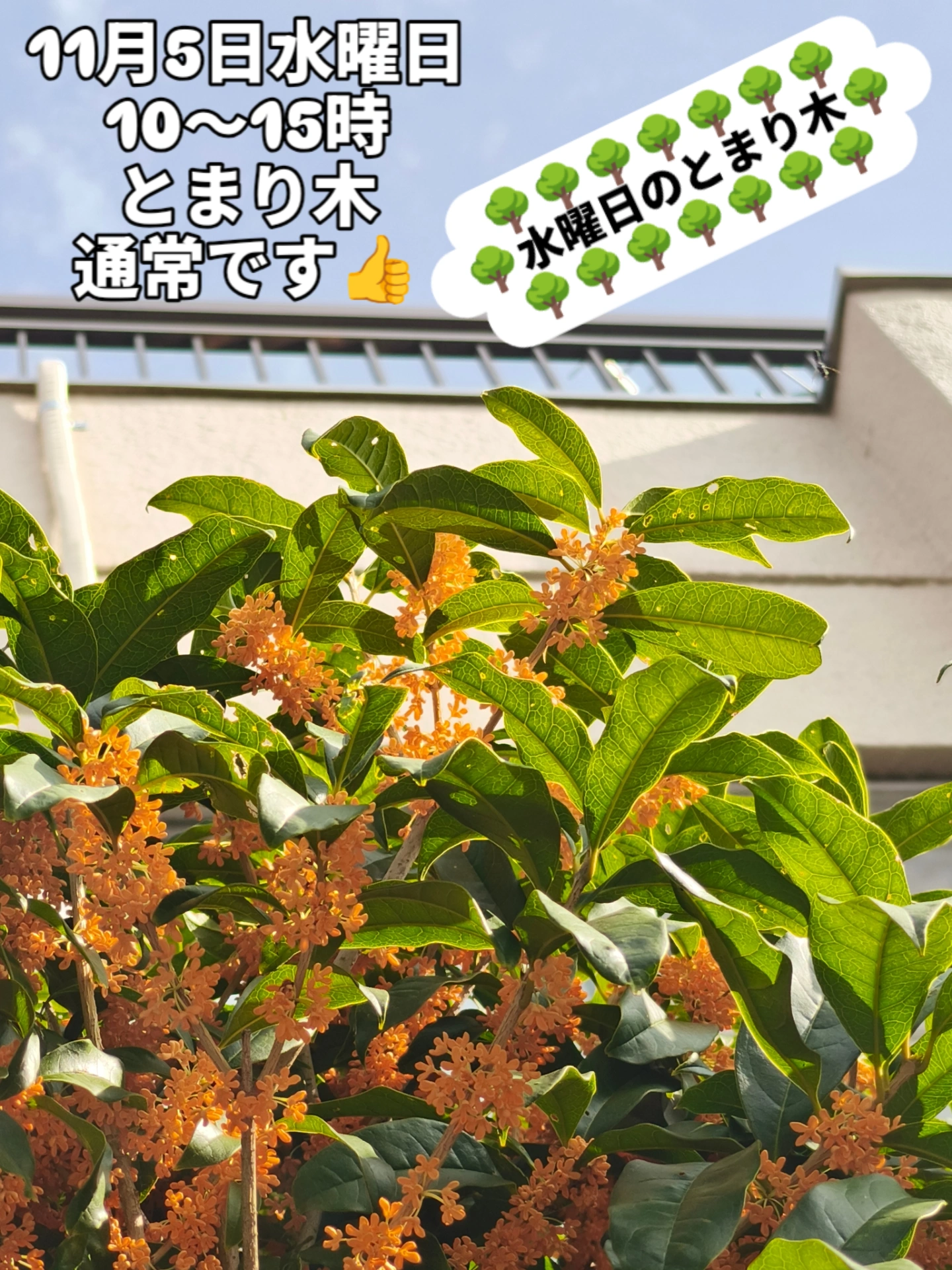 11月5日水曜日 10:00〜15:00とまり木、普通にやりますよ〜🤗今ならもれなく、満開のキンモクセイが見れます👍️もちろん、香りも楽しめます