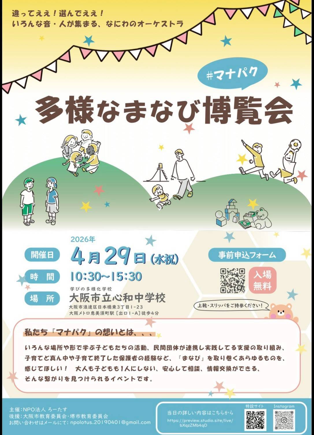 今日はイベントのお知らせです。学校関係、先生方、行政関係の皆さんにぜひ来ていただけたら、と多くお声かけさせてもらってます!山本もマナパク運営スタッフとして広報担当で奮闘中です。4月29日(祝)に会場の